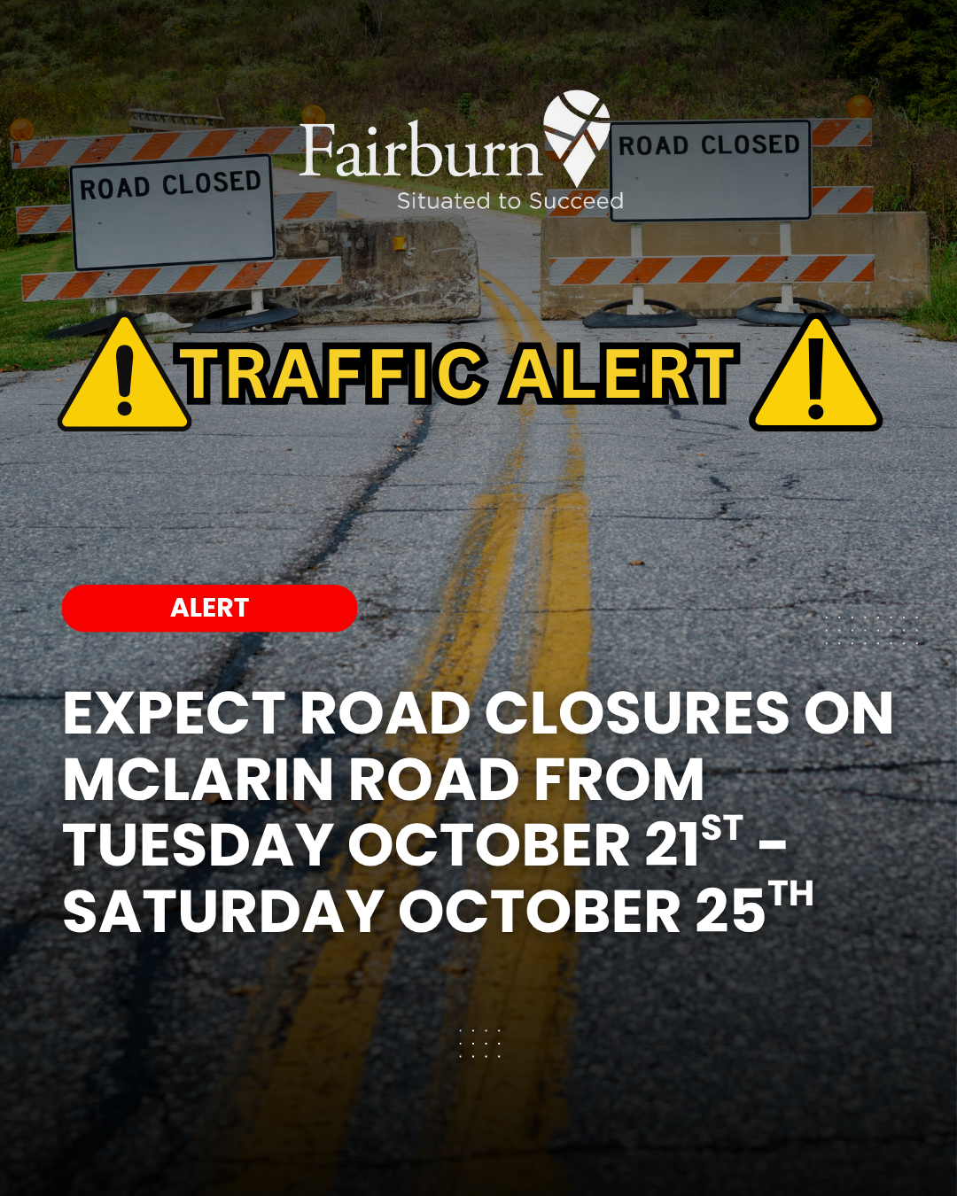 Drive carefully, follow posted signs, and stay alert for construction crews! Thank you for your patience as we work to improve traffic flow and safety in Fairburn!