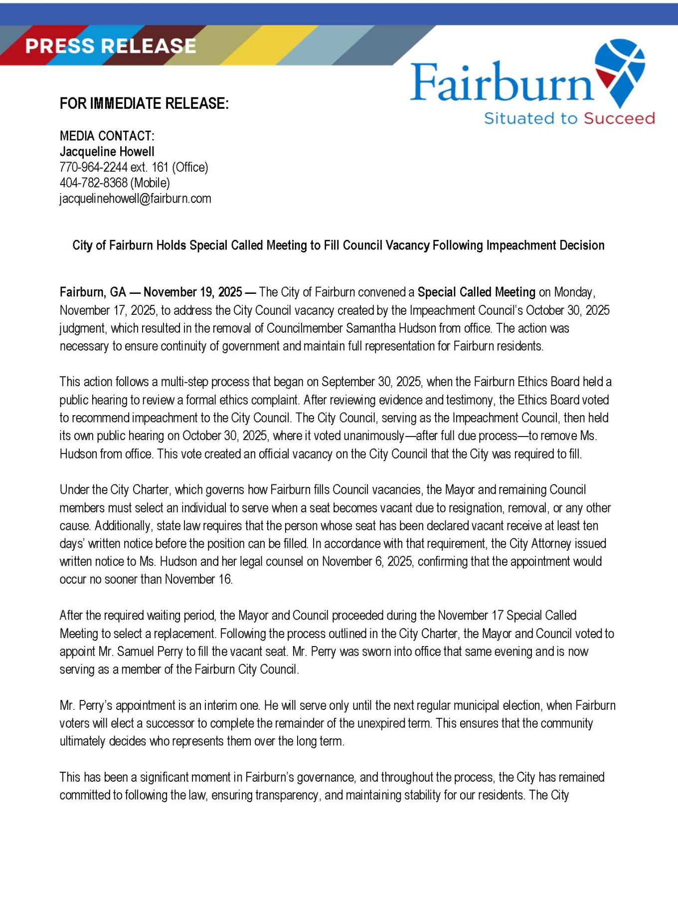 The City of Fairburn’s municipal elections have concluded, and all precincts have reported. The results below reflect the votes cast on Election Day. Final results will be certified by the Fulton County Board of Elections.